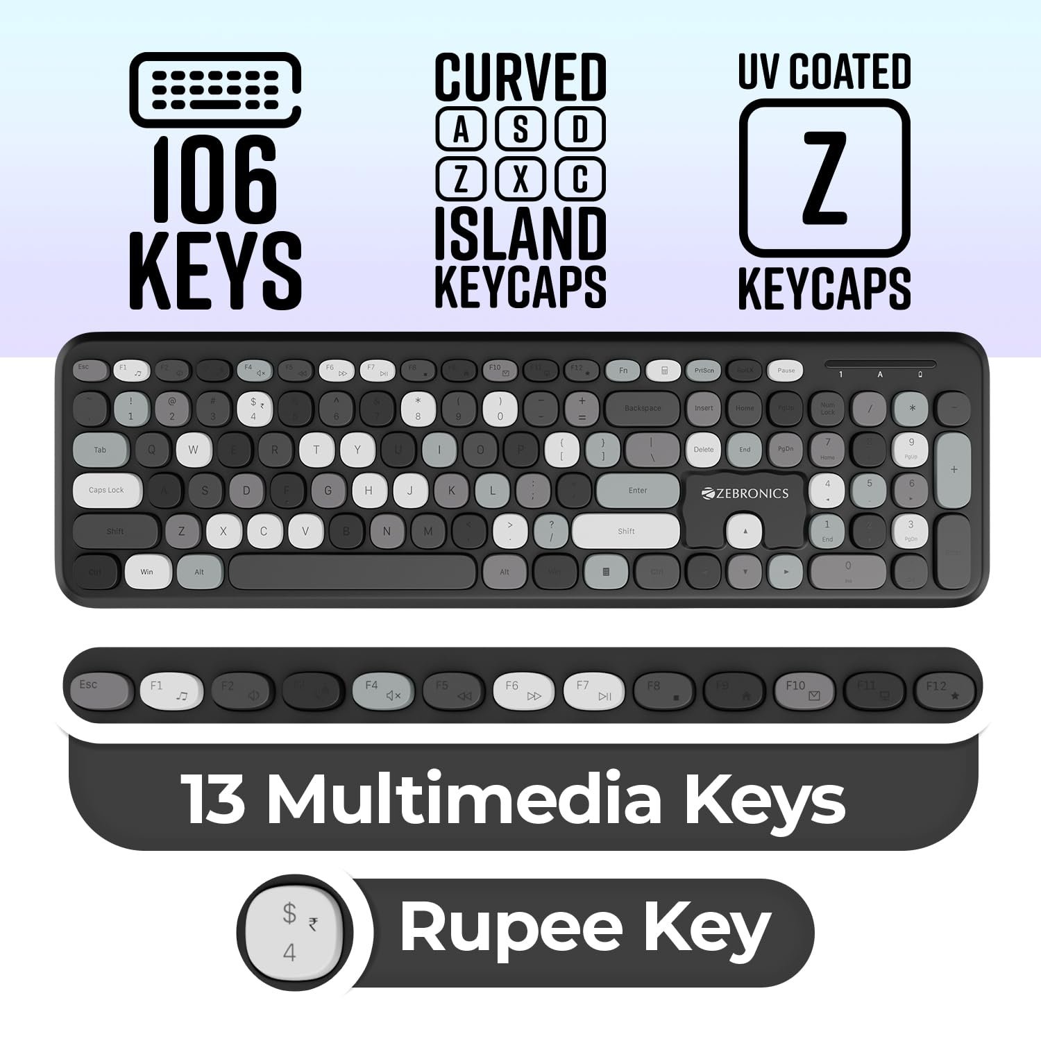 ZEBRONICS Companion 302 2.4GHZ Wireless Keyboard & Mouse Combo with UV Printed Keys,13 Multimedia Keys,800/1400/1600 DPI,High Precision,Advanced Optical Sensor Technology(Black + Grey)